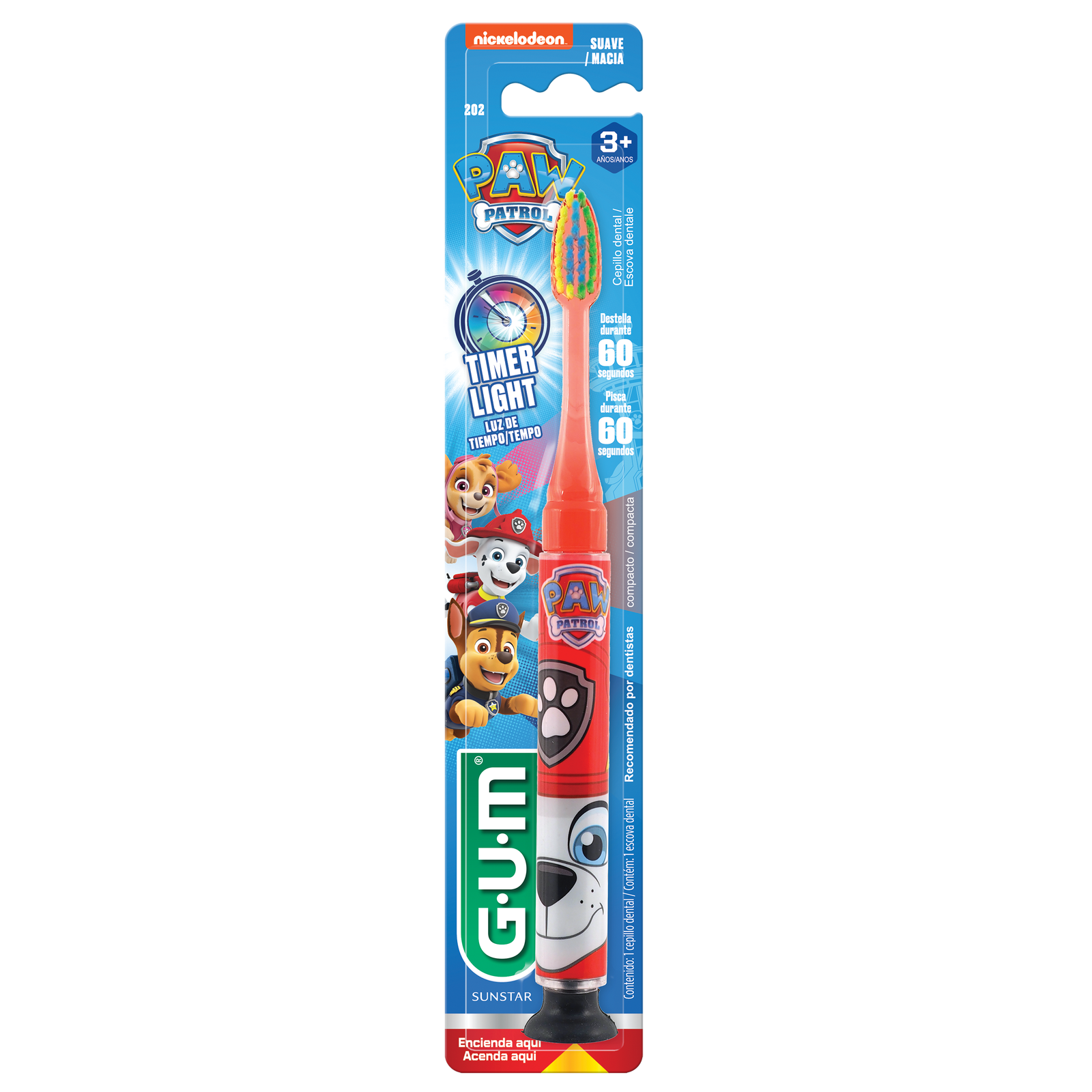 El cepillo con luz Paw Patrol de GUM® tiene luces LED que iluminan todo el cepillo y se encienden durante 60 segundos para animar a los niños a cepillarse los dientes durante más tiempo. El tiempo recomendado por los dentistas para el cepillado es de 1 minuto para cada maxilar.