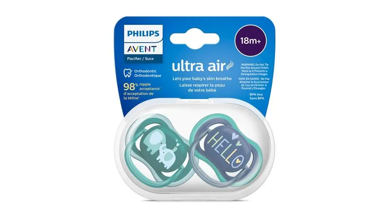 Tranquilidad con la comodidad del aire. El chupete ultra air de Philips Avent tiene orificios de aire extragrandes para mantener seca la piel de su bebé. Tiene una tetina extrafirme para dientes y encías en crecimiento. Disponible en varios colores y diseños.