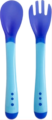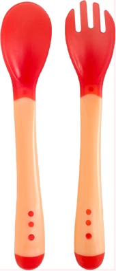 Cuchara y Tenedor con sensor de temperatura que se activa con el calor dejando la silicona de color blanquecina.
