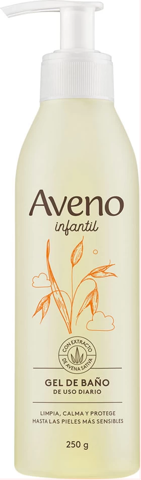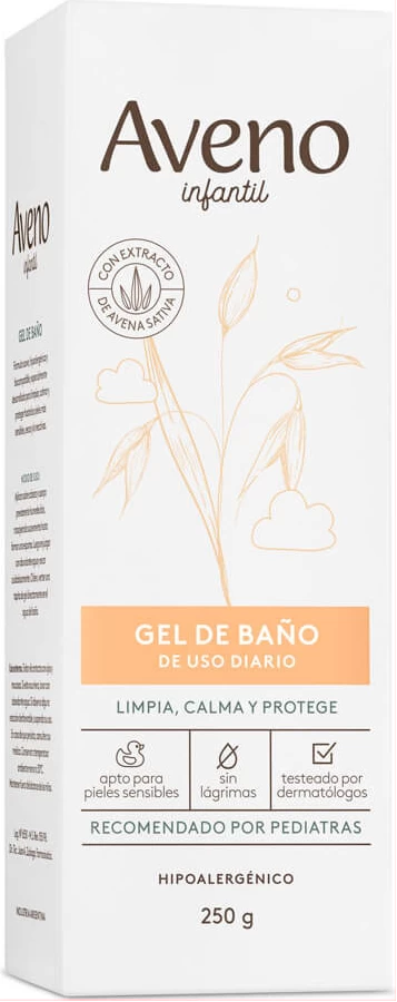 El gel de baño Aveno Infantil es un limpiador de uso diario, humecta y protege las pieles sensibles y reactivas de los niños. Su formulación con avena natural brinda una limpieza suave y agradable en la delicada piel de los más chicos, ya que es hidratante, nutritiva y regeneradora. No irrita los ojos y no contiene perfume. De fácil enjuague. Sin parabenos.