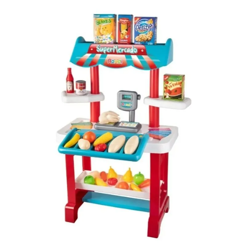 Gran superficie de exposición- estantes movibles- balanza para pesar las diferentes frutas- verduras- panes y pollo- diferentes variedades de productos de almacén y tarjetas con precios para organizar los diferentes productos.